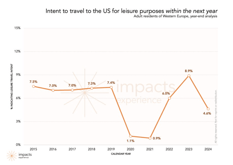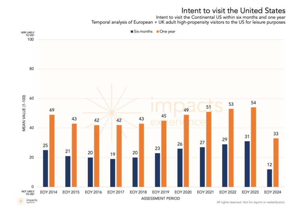 The findings are alarming. The percentage of adult residents in Western Europe who intend to visit America in 2025 is nearly half that of those who intended to visit in 2024. If these sentiments and intentions prove durable, US organizations are likely to welcome far fewer international travelers in 2025 than in any recent year other than those most affected by the pandemic.