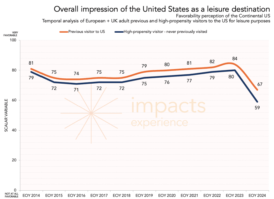 The overall impression of the United States as a leisure destination dropped precipitously from the end of year 2023 to the end of year 2024. This decrease was born of uncertainty surrounding the outcomes of this unique US election. (You’ll note that this dramatic decline in perceptions did not take place in previous election years.) These concerns range from the administration’s stances on items ranging from gun control to strengthening the US dollar (https://www.nytimes.com/2024/11/14/business/strong-dollar-trump.html) – conditions that risk making international travel to the US less favorable.